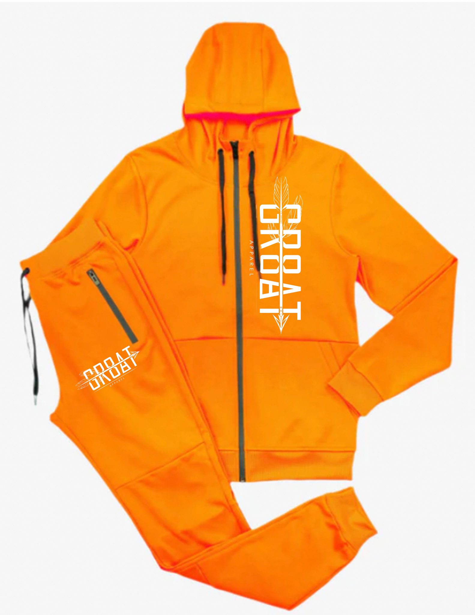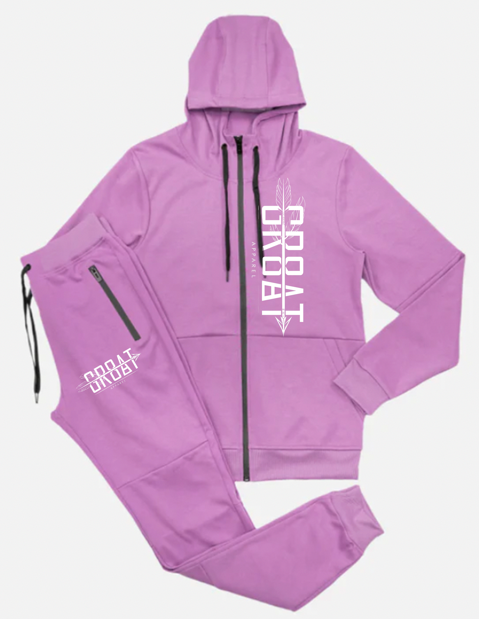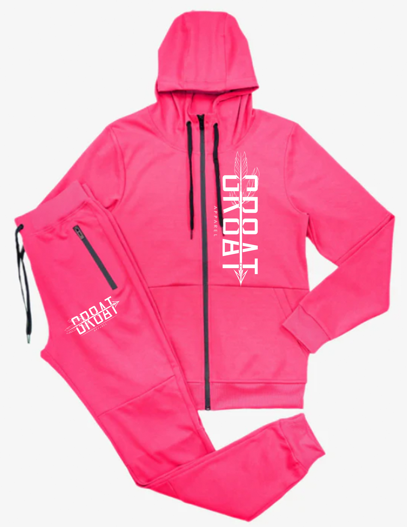 Two piece jogger set that includes pants and hooded jacket. Pockets on side and back of pants as well on the jacket. Draw string for size adjustments is provided also.