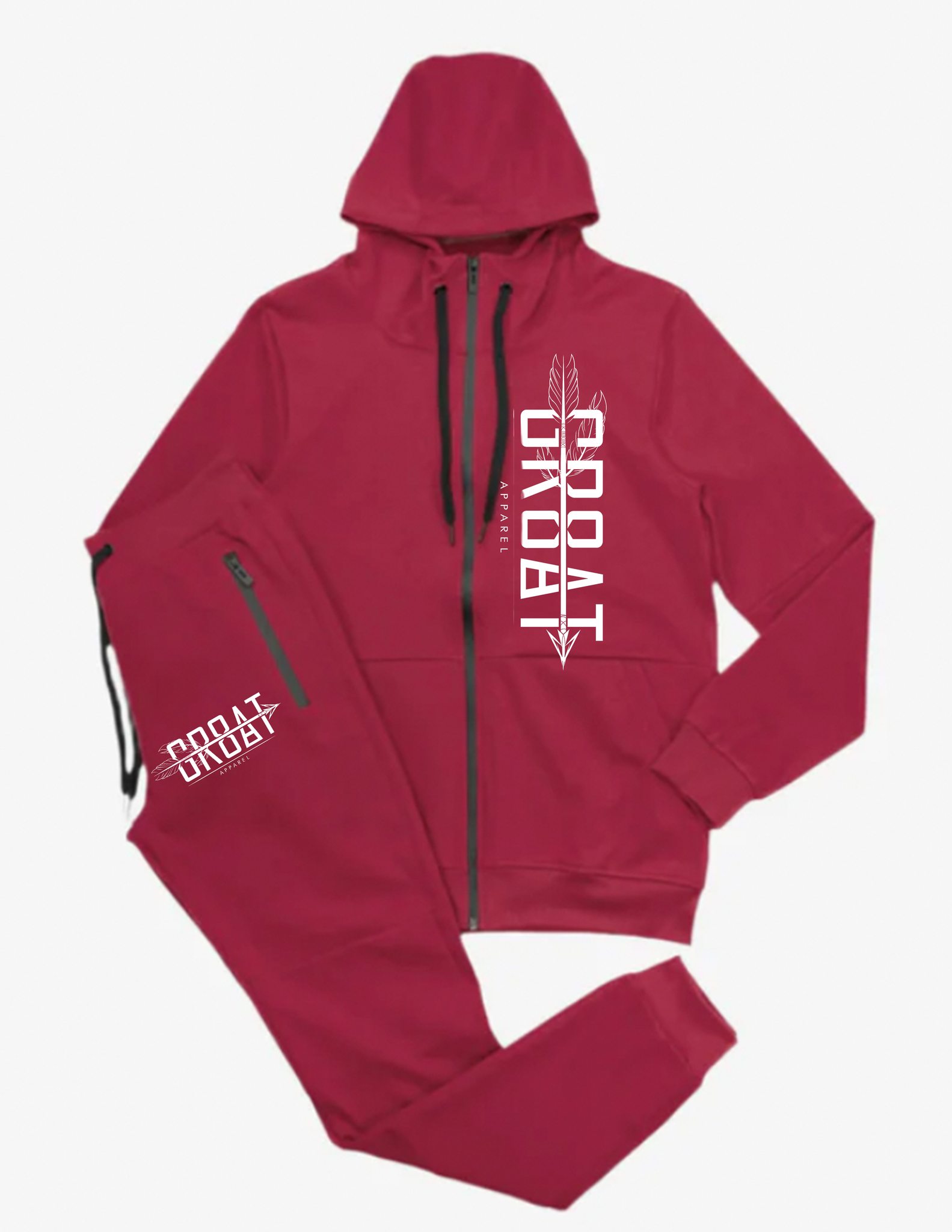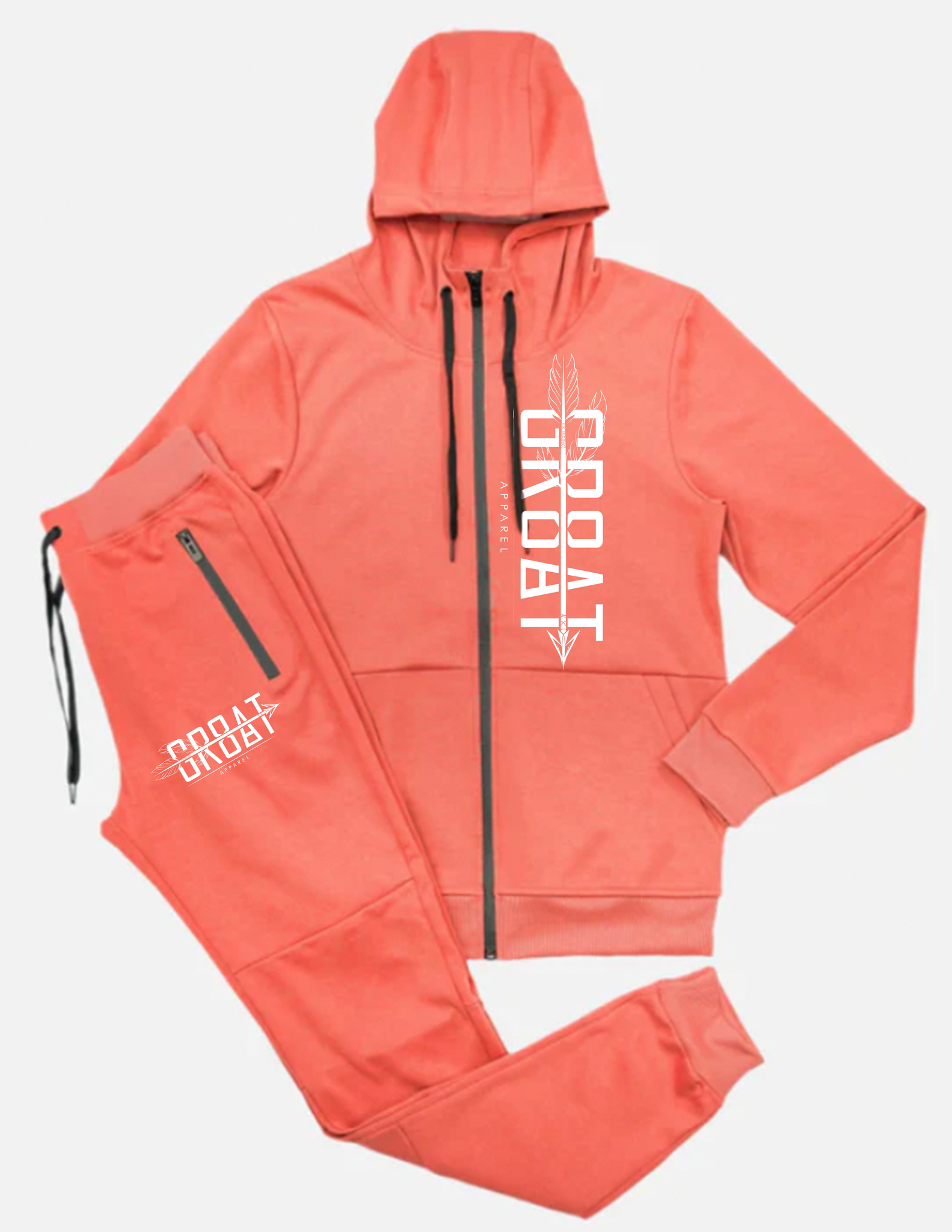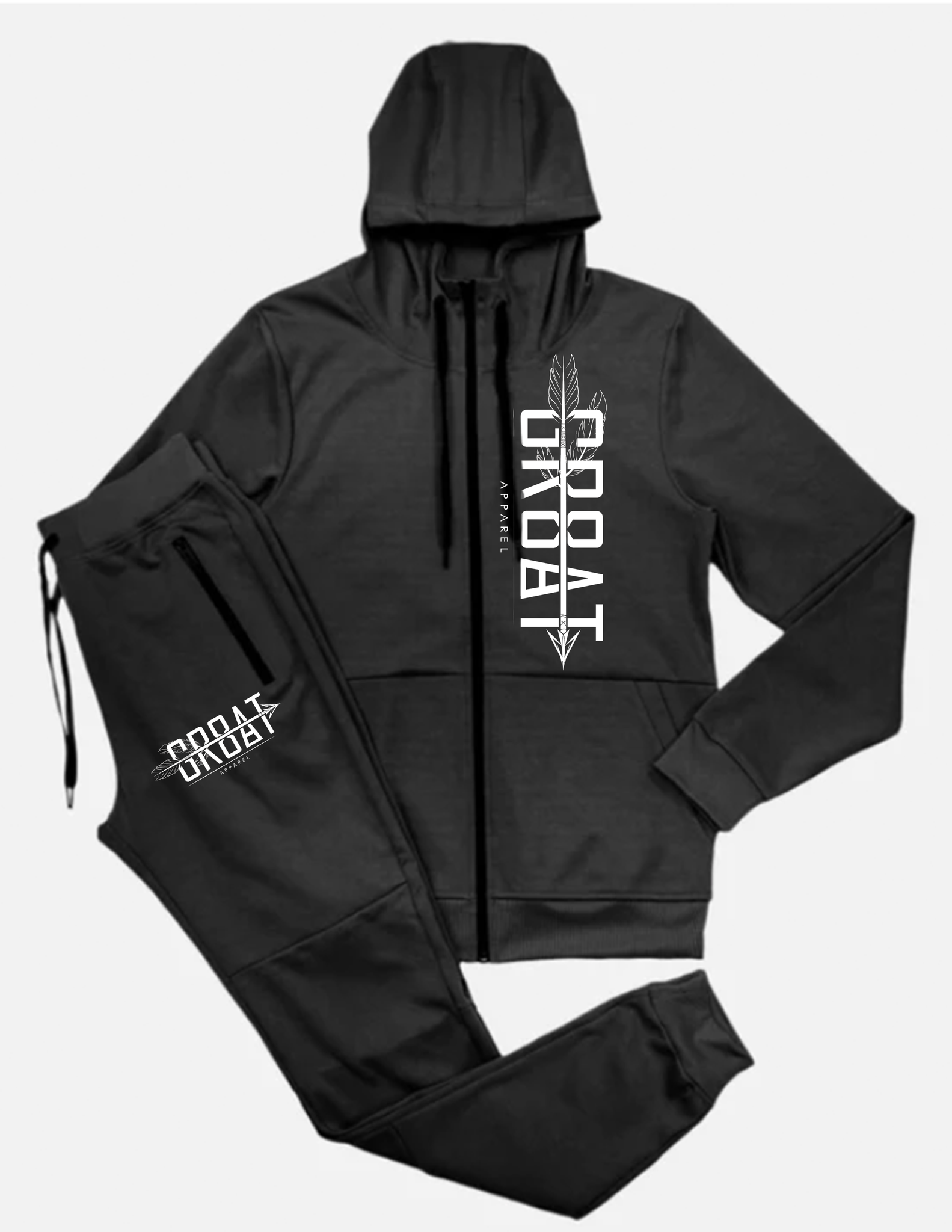 Two piece jogger set that includes pants and hooded jacket. Pockets on side and back of pants as well on the jacket. Draw string for size adjustments is provided also.